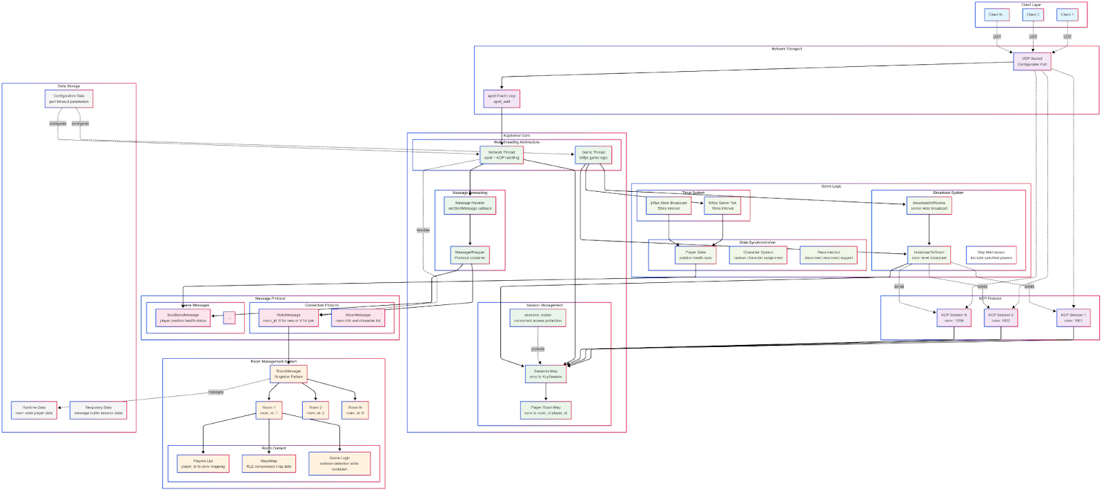 Room system: Each match is an independent room with all logic managed server-side (not fully authoritative for rapid iteration).