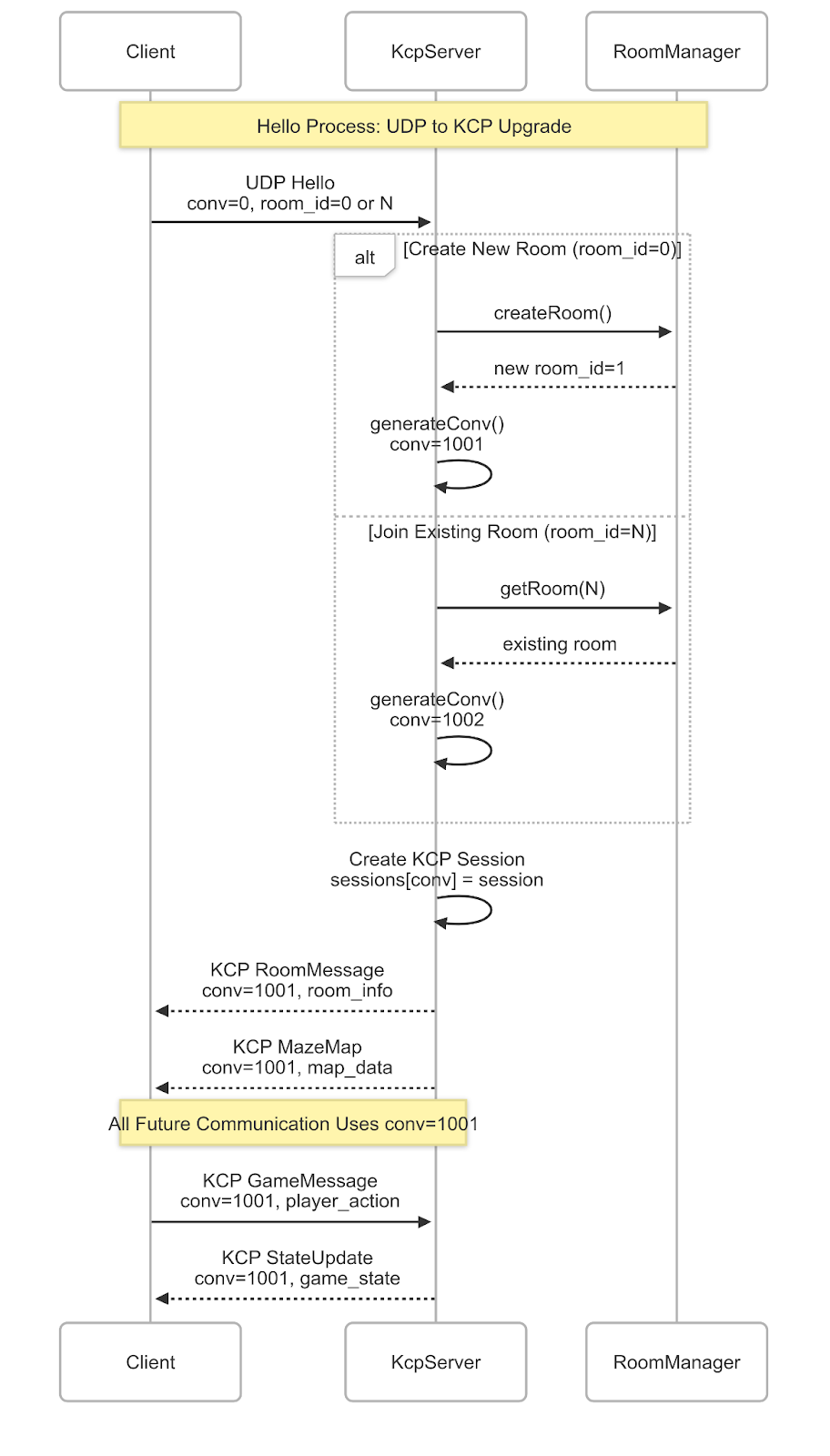 UDP with KCP protocol for real-time, low-latency communication.